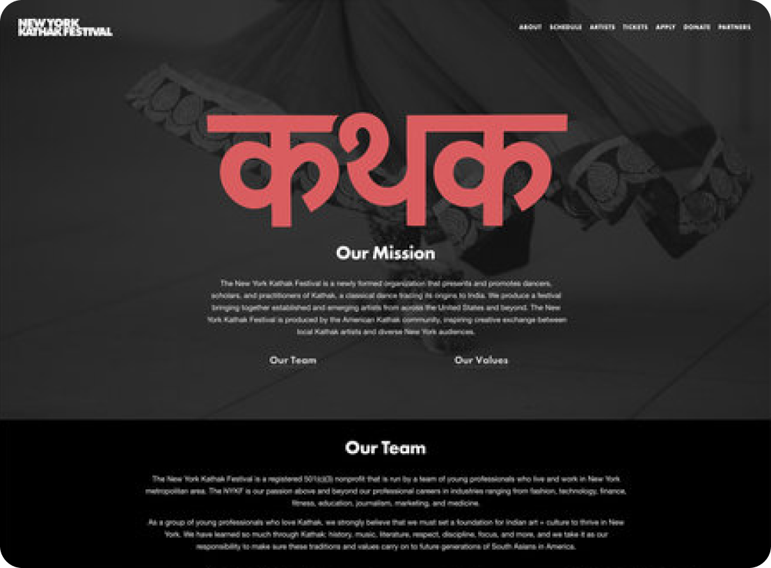 I designed the visual identity, associated guidelines, website, and all promotional material for the New York Kathak Festival, a classical arts non-profit organization that needed a simple visual identity that would translate cohesively across many different touch points.